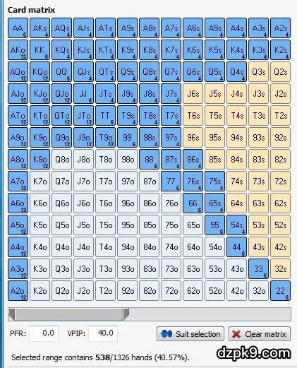当所有玩家都弃牌,轮到小盲位置加注时,大多数小盲玩家会用大约40%的牌作率先加注(open raise)。他们的范围类似于下面的图表: