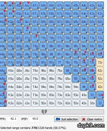 这个起手牌表格是一个非常可靠的标准范围。随着你逐渐习惯轻松自如地用这个范围游戏,你可以增加更多防守牌(跟注牌)、更多价值3bet牌和更多诈唬3bet牌。https://www.moshike.com/