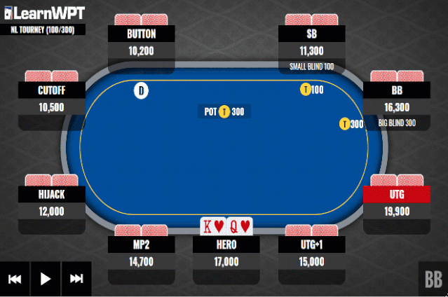 如果我们对UTG+1玩家的持续下注全压,他将可能放弃一手不错胜率的牌。对我们来说,拿下一个无竞争的底池给我们增加50%的筹码量是一个极好的结果。