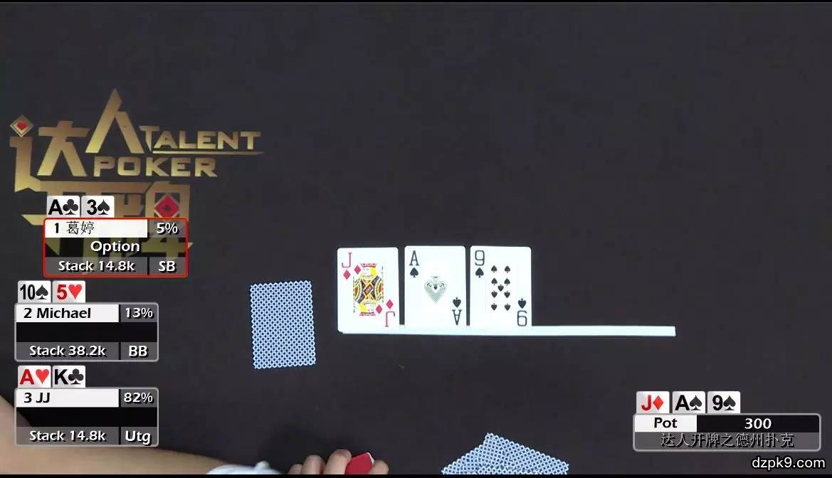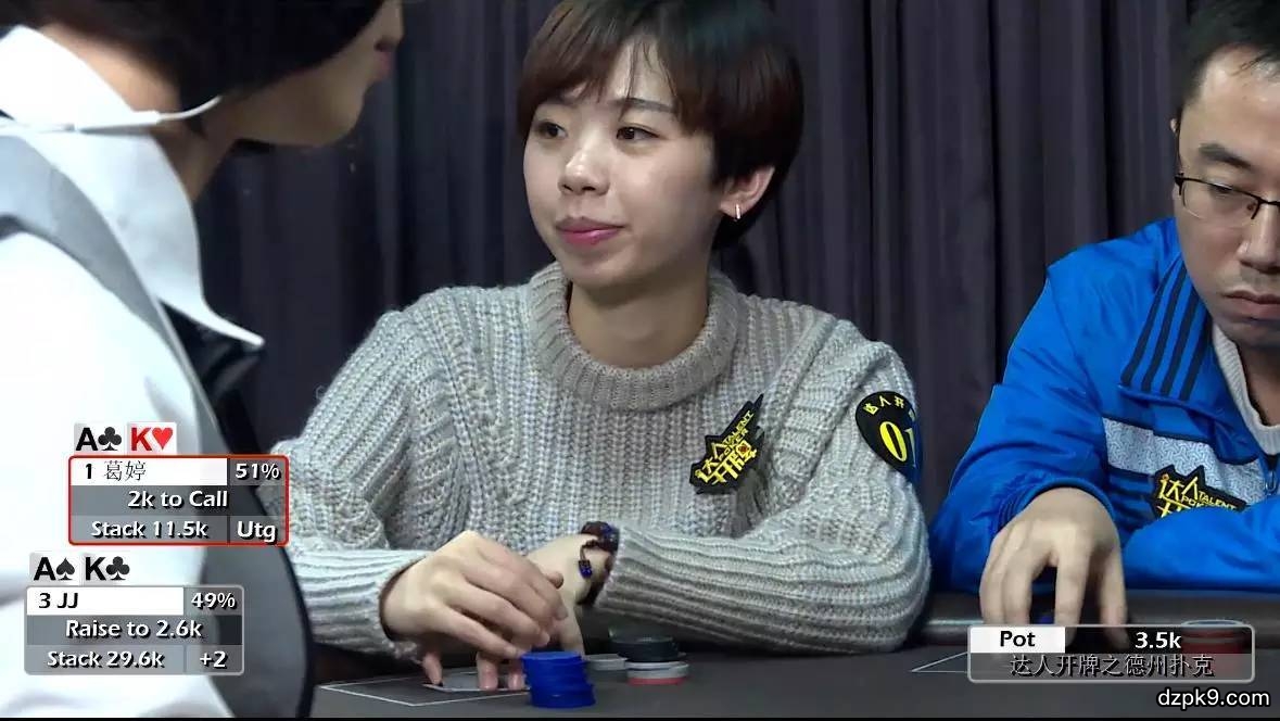 (当JJ和葛婷同样手持AK再次对战,翻牌前已定胜负,这种“不战而屈人之兵”的情形也是非常耐人寻味。请观看文章最后节目视频。)