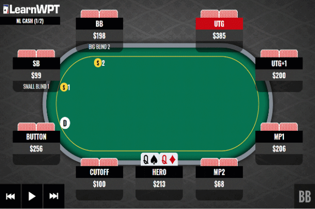 翻前:枪口位(UTG)率先加注到6,你在劫位(HJ)拿着Q♠Q♦再加注(3bet)至18,其他人弃牌,只有枪口位跟注。