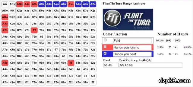 即使对手用部分Ax组合(蓝色标记的底牌)check-raise,你仍然在66%的时候被打败。如果对手碰巧用带后门同花听牌的卡顺听牌check-raise,平均而言你仍然拿着比他差的牌。只有对手用所有Ax组合去check-raise时,继续玩下去者是有意义的,而这种情况很少发生。
