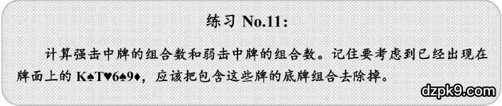 做完上述练习,你应该会发现,弱击中的牌比强击中的牌多。这是一个常见的情况,这张9♦增强了翻牌圈弱击中的牌中相当大的比例。一张牌有可能增强一个很宽的底牌范围,但它不可能使所有得到增强的牌都变的很强。许多牌的增强,都是很微弱的,仅仅使鄱牌圈的弱击中牌成为了转牌圈的弱击中牌。在这个例子中,转牌的9♦增强了许多卡顺听牌和第二,第三大对子的牌,使它们成为了转牌圈上的对子加卡顺听牌。