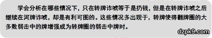 选择诈唬的玩法,还是在转牌就放弃,通常是依据这个考虑的。如果大多数河牌都适合诈唬,那么诈唬的玩法通常是更好的。但是如果大多数河牌都使你无法诈唬,那么通常来说你在转牌就应该放弃。