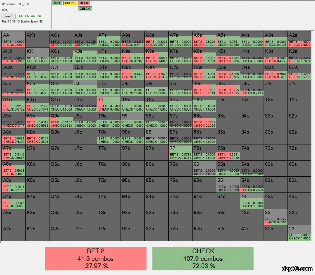 你会在各种底池中,在各种情况下游戏这些公共牌面。由于这个主题非常宽泛,我将为你分享六个一般技巧,每个技巧都将指导你更频繁地做出正确决定。了解相对牌力是一个好牌手的基石。当四连张完成时,像两对和暗三条的牌力就明显比之前弱了很多。尤其是在前一回合下注后,但即使你没有下注,这个事实仍然成立。我们来看看Solver软件如何被动处理这种情况(大盲玩家在单一加注底池对抗按钮玩家,翻牌圈有一个持续下注):在J♠9♥7♦8♥公共牌面,Solver软件在这种场合只在16%的时候下注。如果你仔细观察,你会发现大多数顺子(JT、T9、T8等)其实都在随后过牌。这是因为按钮玩家没有任何坚果优势。如果他下注,他多半会被同一手牌(同样的顺子)跟注。但他也会错过从大盲玩家那里获得价值,因为大盲玩家有机会在河牌圈诈唬。在四连张转牌面,你的对手往往会有许多可预见的,用来诈唬的顺子听牌。因为这个原因,你不应该只关注对手范围中的顺子部分,也要记得他很容易过度诈唬。尤其是你在翻牌圈随后过牌,转牌圈发出四连张的情况下,更要注意这一点。我们来看看在J♠9♥7♦8♥公共牌面的范围分布(大盲玩家在单一加注底池对抗按钮玩家的随后过牌):说明:蓝色方框表示大盲玩家可能拿到多少种顺子组合(82.8)。红色方框表示大盲玩家可能拿到多少种顺子听牌组合(60.8)。大盲玩家范围中有87种顺子组合。但他范围中还有61种卡顺和双头顺组合,以及36种同花听牌和组合听牌组合。如果对手下注范围中有许多潜在的半诈唬牌,那么你可以用你最强的非顺子听牌做一些跟注。别只关注对手可能拿到的强牌!(除非他玩得特别紧弱)3. 若你的对手没显示出对底池的兴趣,那么你稍微放宽你的价值下注范围。如果你的对手被动地游戏这手牌,要么是在有利位置随后过牌,要么是在不利位置连续过牌两次,你可以稍微放宽你的价值下注范围,使它不仅仅是顺子。尤其是当大盲玩家在单一加注底池对抗按钮玩家时,当对手在翻牌圈随后过牌,或他两次对你过牌后,用两对和暗三条做一些薄价值下注。例如,假设你的对手在A-Q-T-J(T代表10)公共牌面对你过牌两次,而你的QJ在转牌圈拿到了两对。即使存在单张成顺的情况,你的牌也值得做一个价值下注(如果不是现在,那么至少在河牌圈做价值下注)。我不建议用比两对差的牌做更薄的价值下注,因为你很难在超过一半的时候被更弱的牌跟注。第四张同花在转牌圈发出,对于范围对抗的胜率分布有很大的影响。换句话说,通常很强的牌(例如暗三条、两对、顺子)失去了大量价值。如果你在之前回合已经做过持续下注,你需要在第四张同花牌发出时开始用这些牌底池控制。你的下注不会足够频繁地到得更差牌的跟注。我们来看看Solver软件在翻牌圈持续下注后在四花公共牌面玩得有多被动(大盲玩家在单一加注底池对抗按钮玩家):Solver软件只在28%的时候二次下注!考虑到即使暗三条(肯定没强到做价值下注)对抗大盲玩家的整个范围也只有略高于50%的胜率,这是合乎情理的。2. 当你在河牌圈抓诈唬时,对手的倾向比平时更重要。假设你在按钮位置率先加注,大盲玩家跟注。你在单色翻牌面持续下注,被跟注,转牌又是一张同花牌,你随后过牌。假设你的对手在河牌圈下注,而你有一手纯抓诈牌(你打不过任何价值下注牌,但你可以打败诈唬牌)。在这种场合,你需要知道对手要么有一手同花牌,要么什么也没有,而且这里驱动他诈唬的良好阻断牌极少。当阻断牌不存在时,用哪些牌去诈唬变成了纯主观的判断。此时,对手的诈唬倾向很重要。如果你的对手是个喜欢诈唬的疯子,考虑做一个比较松的跟注。如果他奉行“紧是对的”原则,你可以做一些相对紧的弃牌。3. 当你在河牌圈诈唬时,对手的倾向比平时更重要。这是与技巧2相反的情况。这次,假设你翻前在大盲位置跟注按钮玩家的加注。你在单色翻牌面跟注持续下注,然后转牌圈你和对手都过牌。当你作为进攻者游戏这种河牌圈场合时,因为阻断牌不是特别重要,你可以自由选择你的诈唬牌。因此,对手在这类场合的过度弃牌,或过度跟注倾向在你的决策过程中至关重要。如果他似乎频繁对进攻弃牌,那你就采用一种激进的诈唬策略。如果他很顽固,那你别做太多诈唬。四连张公共牌面和四同花公共牌面真的很难游戏。选择诈唬牌可能是种挑战,而了解对手的倾向比平时更重要。希望这六个技巧能帮你更轻松地应对这些公共牌面。这就是本文的所有内容。感谢阅读,祝你桌上好运!