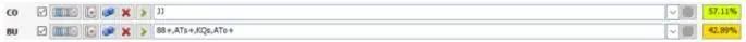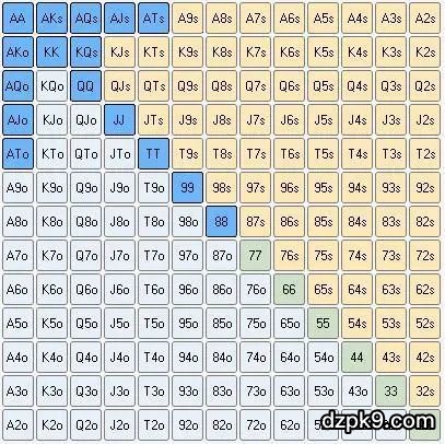 你现在在娱乐场打一场200美元买入的锦标赛,目前盲注是100/200,有效筹码深度是7000(35BB)。你在CO位置用J♠ J♥率先加注到450,按钮位置的玩家3bet到1100,两个盲注玩家都弃牌,轮到你行动。按钮玩家可能是为了价值3bet,也可能是诈唬。如果你全压,你估计按钮玩家会用下面的范围跟注: