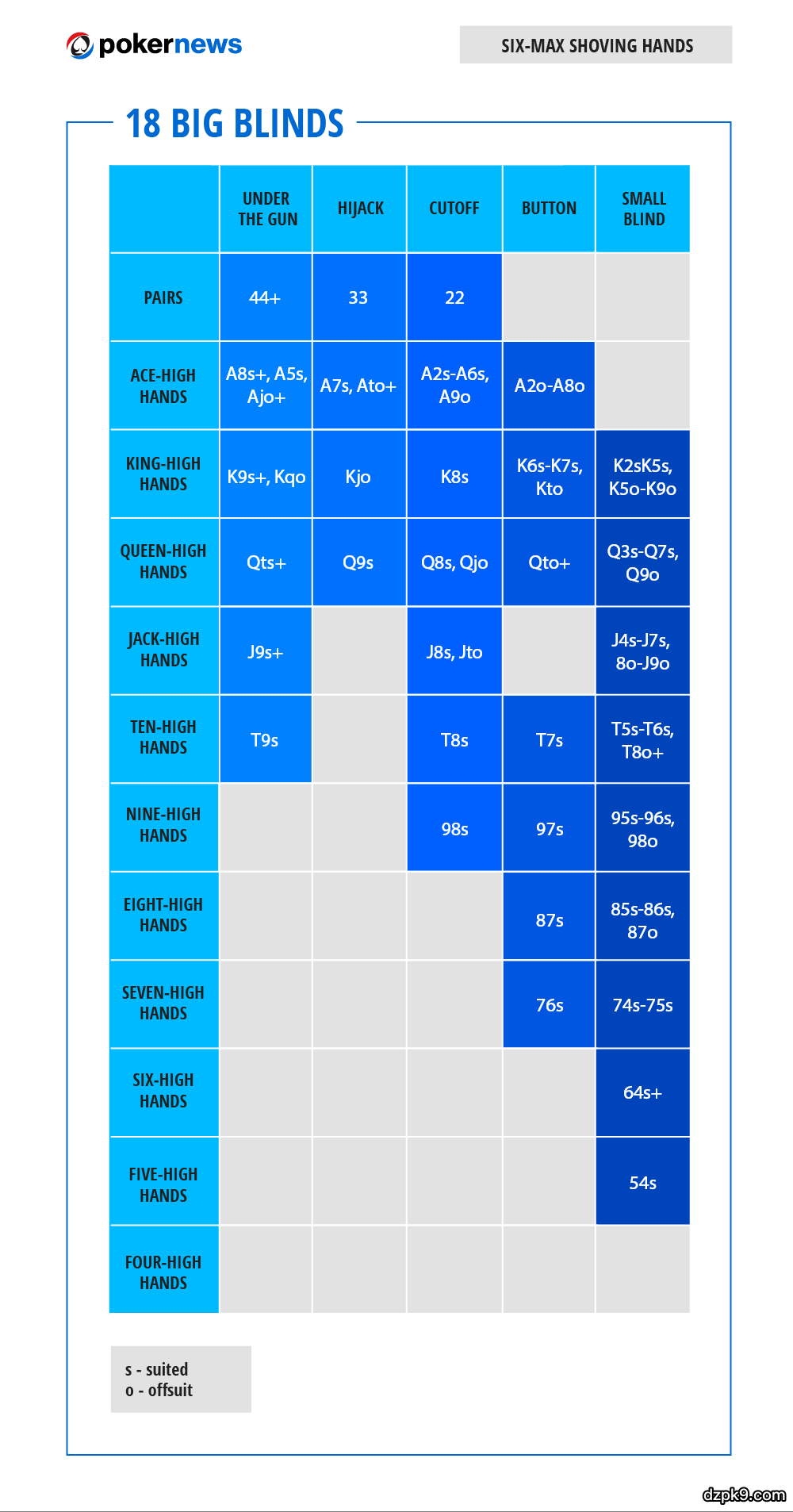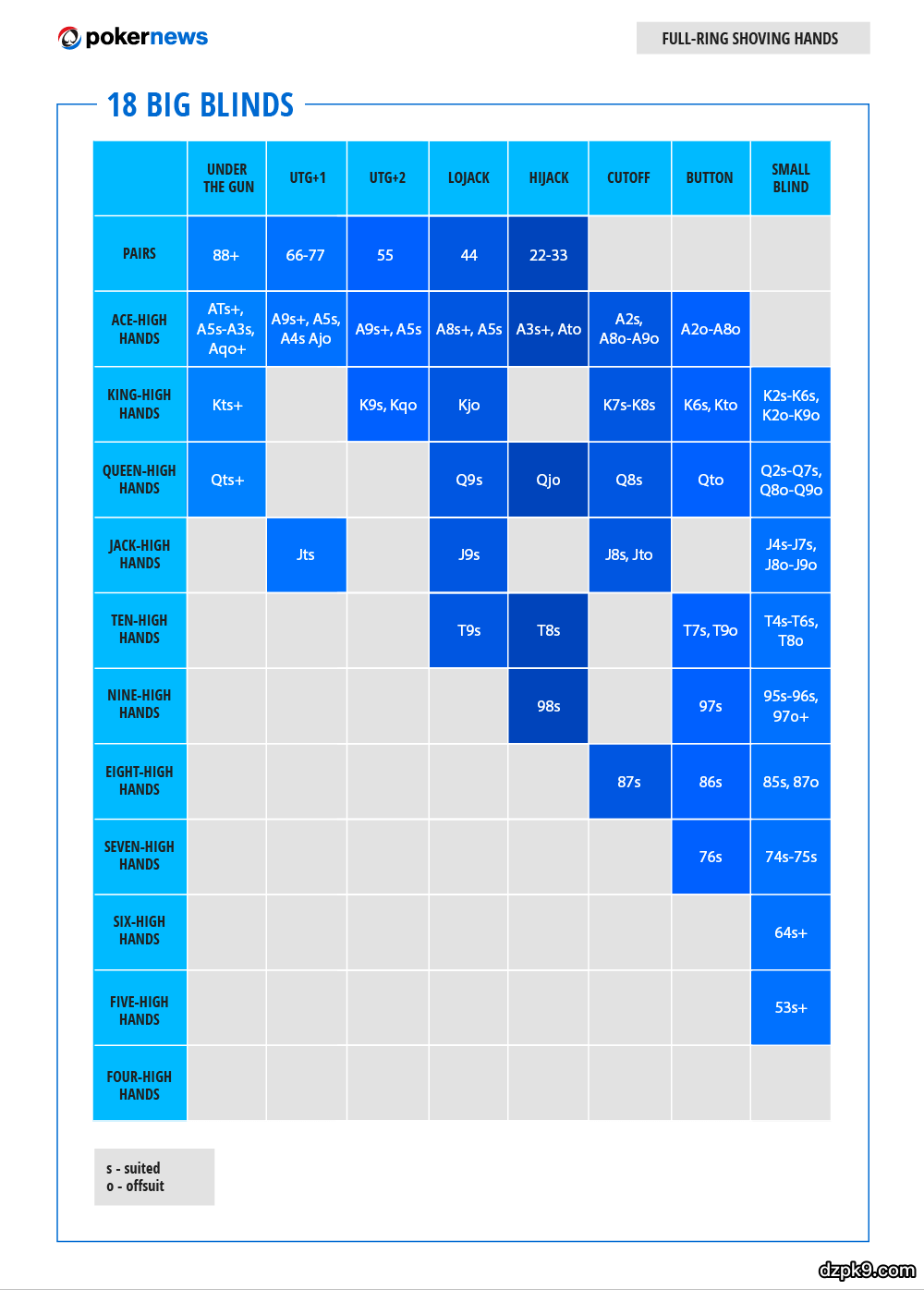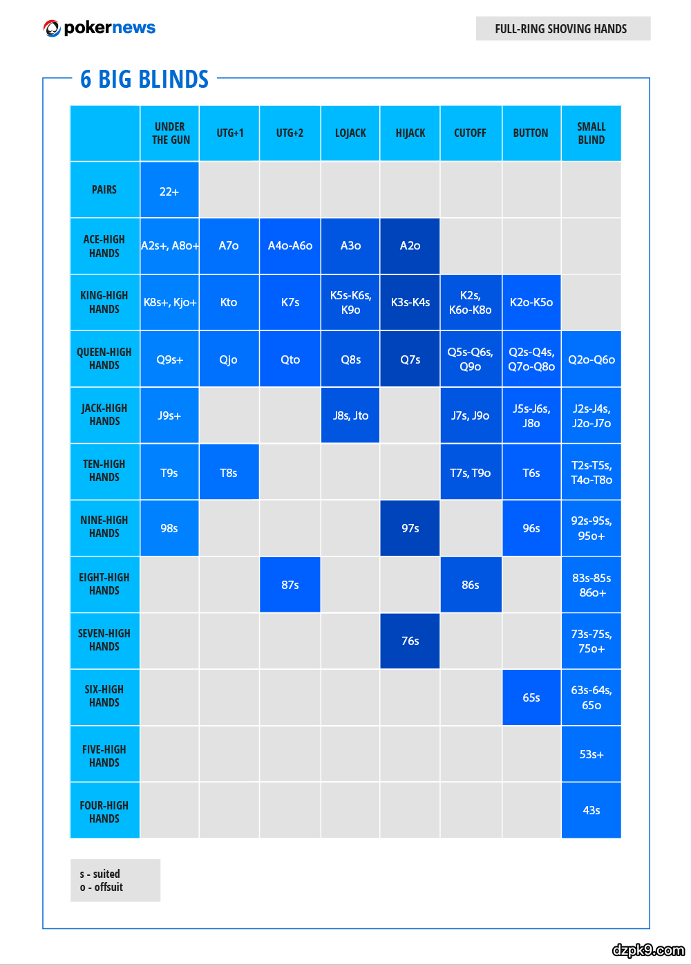 以下是10张能够对你们有帮助的扑克范围表。它们大致有两个类别:满员桌和六人桌。每个类别都给出了五种不同的筹码量,从6个大盲开始,到18个大盲,每次递进3个大盲。