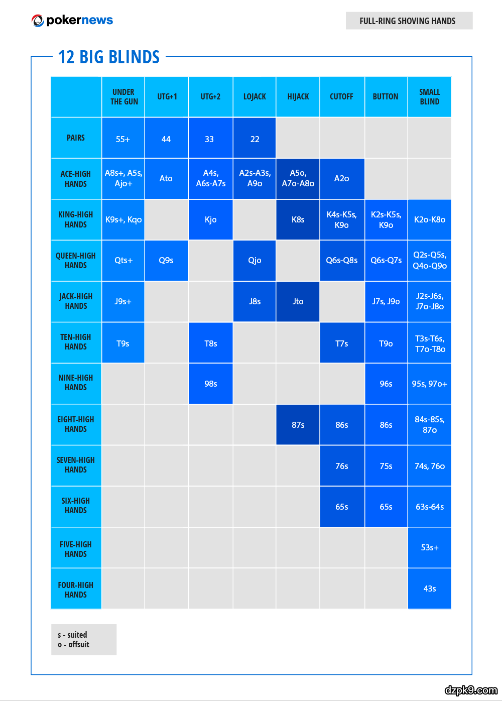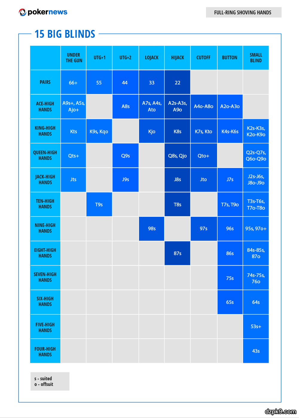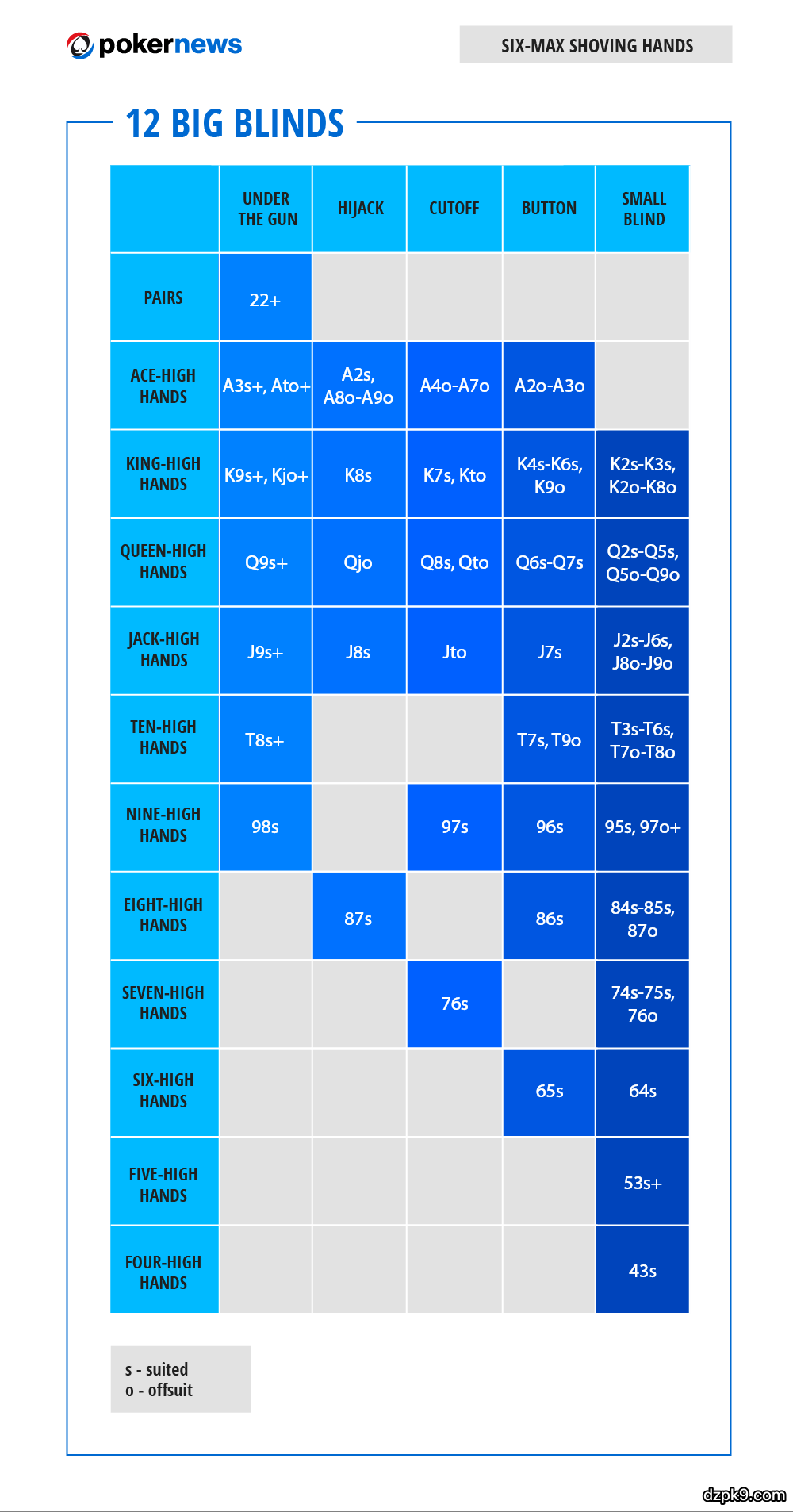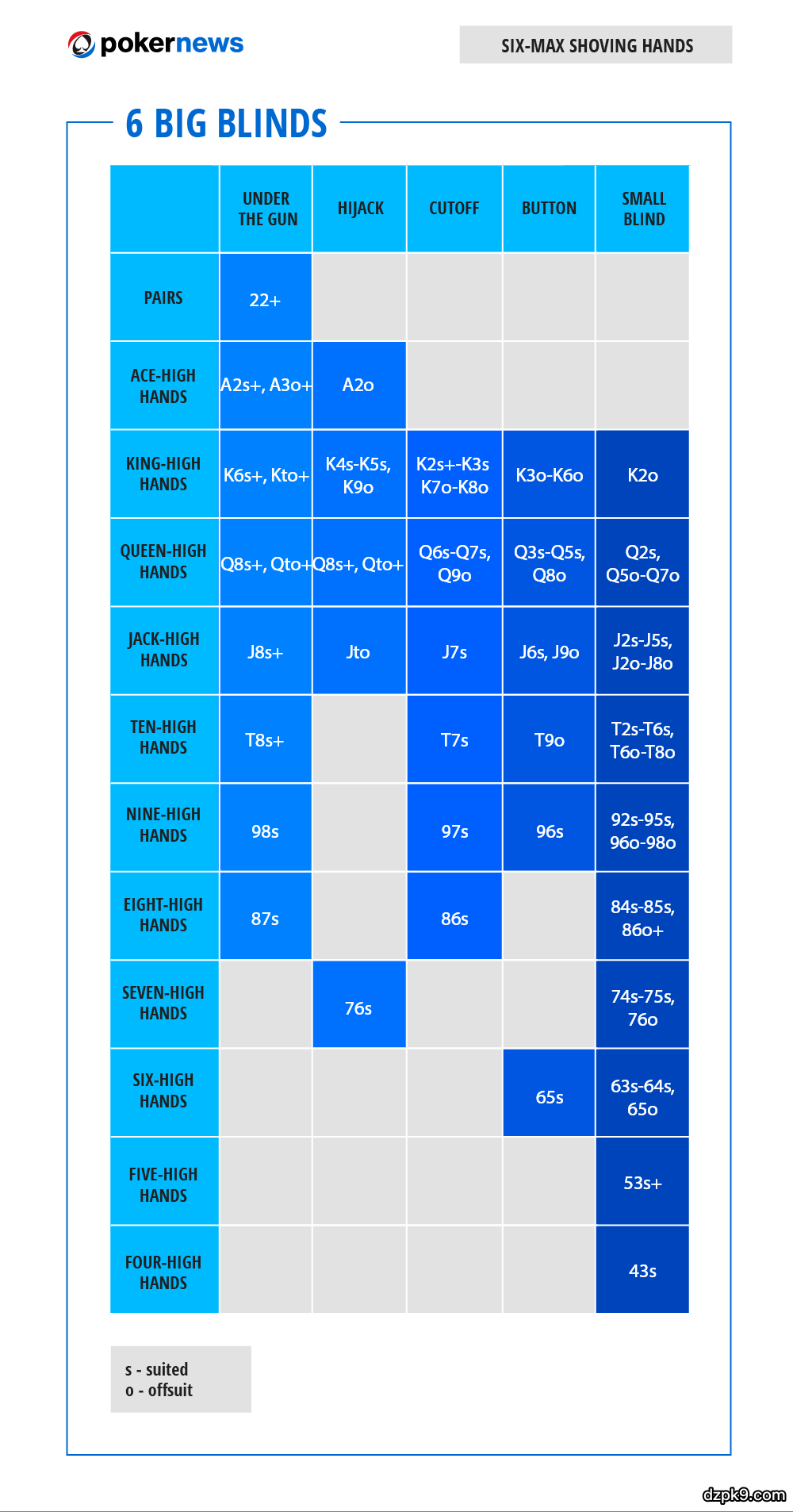 以下是10张能够对你们有帮助的扑克范围表。它们大致有两个类别:满员桌和六人桌。每个类别都给出了五种不同的筹码量,从6个大盲开始,到18个大盲,每次递进3个大盲。