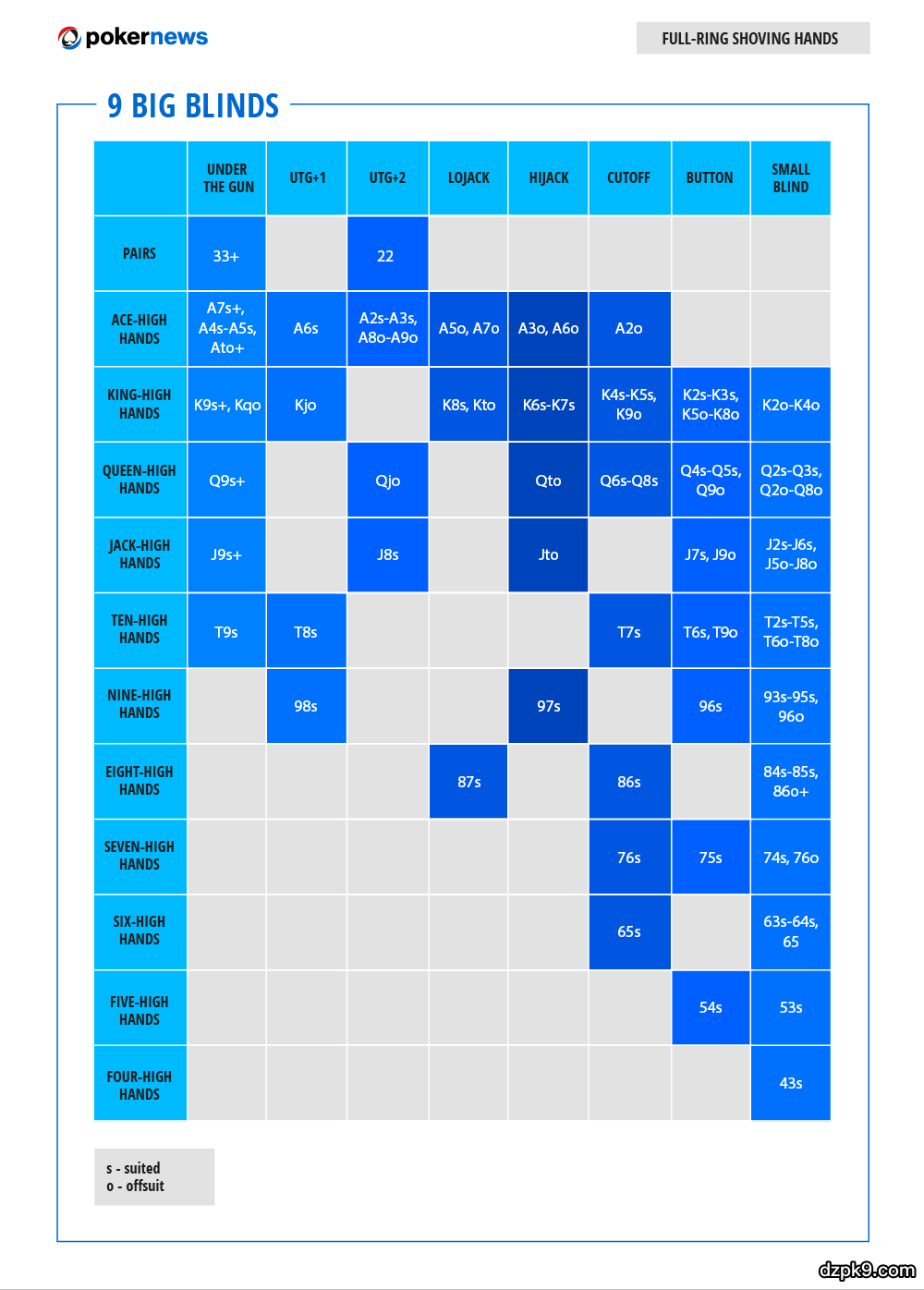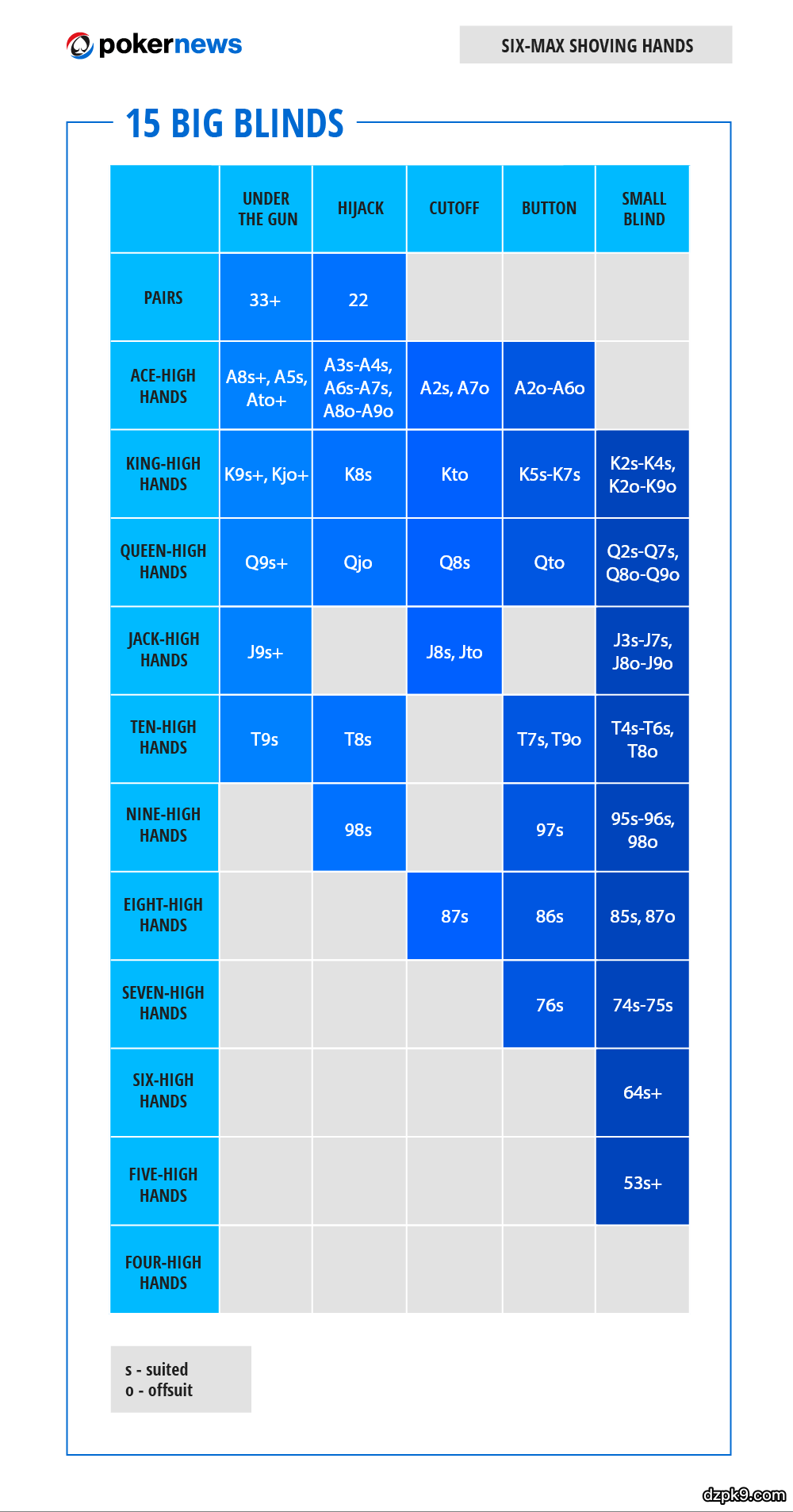 我们在九人桌(满员桌)和六人桌的游戏中给出了五种不同码量的翻前范围表,以下是使用方法:
