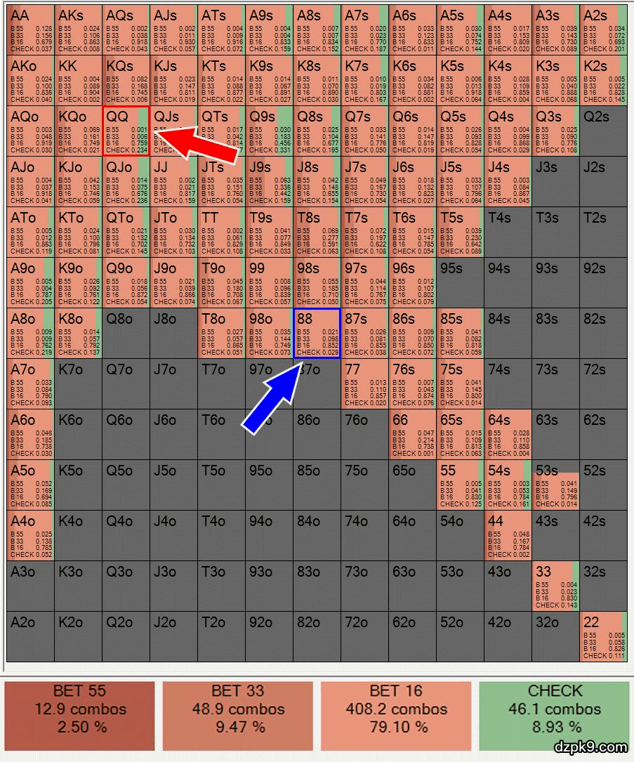 简而言之,相比用QQ下注,用88下注会更多的阻止大盲位的范围实现底池权益。我们仔细看看为什么会这样。