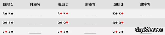 请查看以下三人全压局面。你能够正确(或接近正确地)填写每手牌的胜率吗?