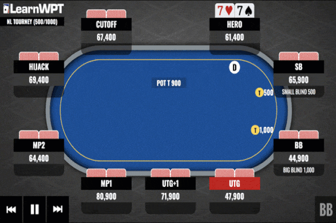 这手牌来自一场网络扑克锦标赛。盲注500/1000,前注100。桌上玩家筹码量如图。翻前,CO玩家率先加注到2500,你在按钮位置用7♥ 7♠再加注(3bet)到7000。大盲玩家跟注,CO玩家弃牌。翻牌是J♦10♦6♠,大盲玩家check,轮到你行动。你会如何行动?check?下注?