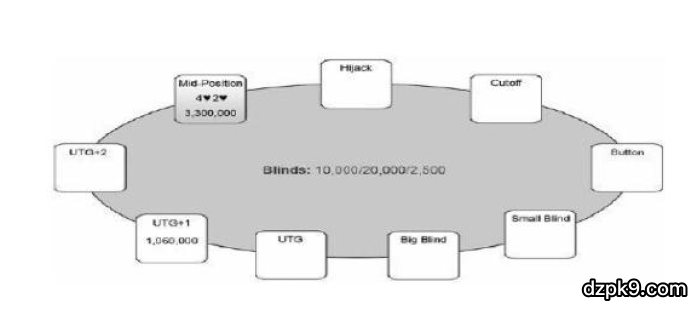 对手1 加注50,000 在UTG+1. 他的风格很弱. 他的筹码量是50 BB ,我可以使用bet 让他进入不利局面,如果我手持JJ+或者AK,我会跟注对手的全下。我的对手筹码不多了所以跟注也没有合适的潜在成败比,所以我这里的3bet 可能会让对手放弃很强的range, 上升到TT or AQ. 所以我mini 3bet 到99,000.底池成败比不错, 对手跟注意. 底池是250,000。
