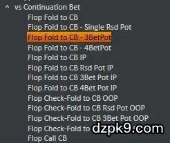 一个是在3bet的底池在翻牌对持续下注弃牌的数据,你可以在HUD中添加“Fold to Flop CB -3betPot”这个数据。这个统计值越高,代表对手在翻牌面对持续下注弃牌的次数越多,你越可以放心大胆对他诈唬。