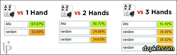 玩多人底池的时候,对手越多,你范围的原始赢率就会越低,就拿AK这手牌来说,它在单挑底池和在两人或三人底池的赢率就很不同。