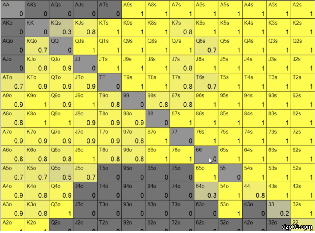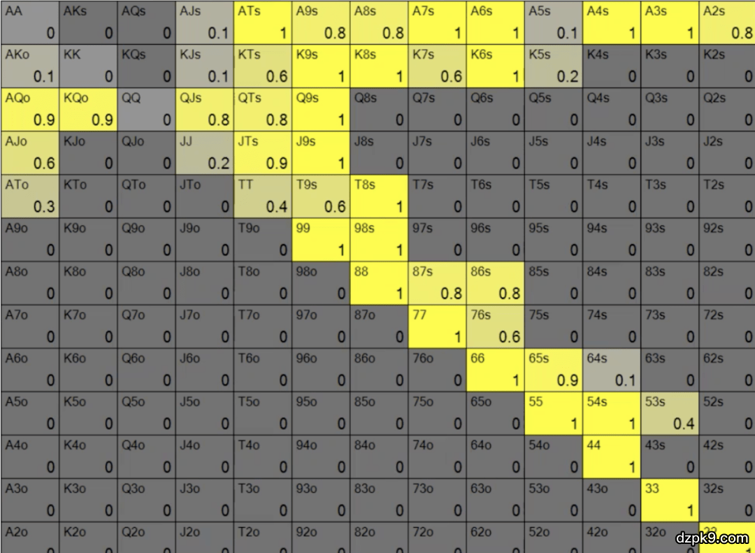 但小盲位的范围就不同了,因为翻前需要担心枪口位和大盲位,翻后需要担心自己没有位置优势。因此,solver更建议你用更紧、更凶的打法来弥补这些劣势。当你没有位置时,你要把筹码底池比变小,以此来弥补劣势。