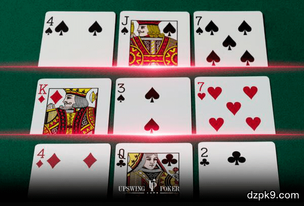 取决于具体的位置关系,你在这种翻牌面的最优持续下注策略将更激进,且采用较小的下注尺度,特别是你在有利位置的时候。这是因为防守者范围中大部分牌通常会错过翻牌,而一个较小的下注将使他范围中的许多牌陷入困境。作为防守者你需要用一些比平常更弱的牌跟注,特别是面对较小下注的时候。你有时应该用带高牌的后门同花听牌甚至A高跟注。你的跟注策略完全取决于对手的下注有多大。当你在有利位置具有主动权时,用一个融合的范围做较小持续下注。例如,在K♦7♥3♠翻牌面用55和88这样的牌下注1/3底池。