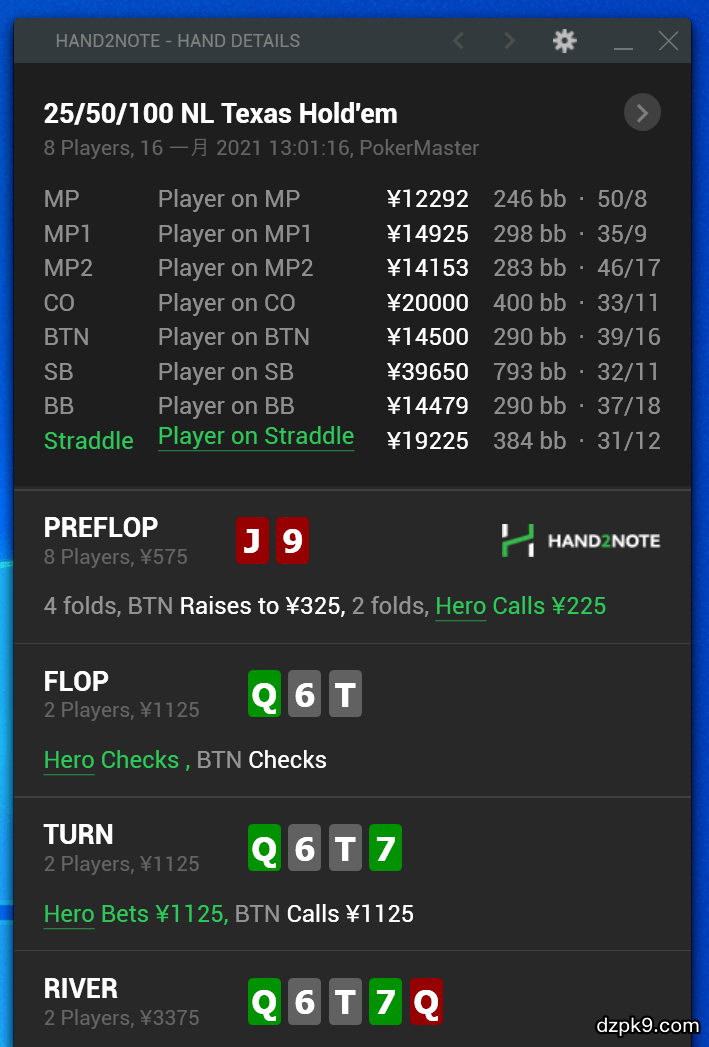 河牌圈:这张Q让所有的听牌都破产了,同时也降低了双方有Q的概率。但是,hero的强牌并不只有Qx,而对手的强牌通常只有Qx,所以这张Q对对手牌力的削弱更大。因为hero仍然有顺子、set形成的葫芦这些超强牌,对手的范围里基本不可能有葫芦和顺子,甚至Qx都很少,所以这是一个非常适合超池下注的场景。