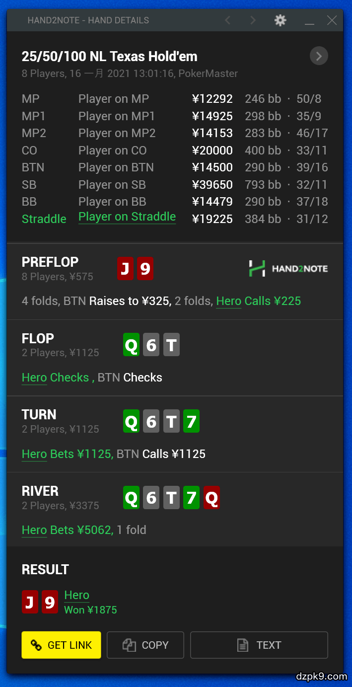 实战中hero选择了下注1.5倍底池诈唬,对手弃牌。