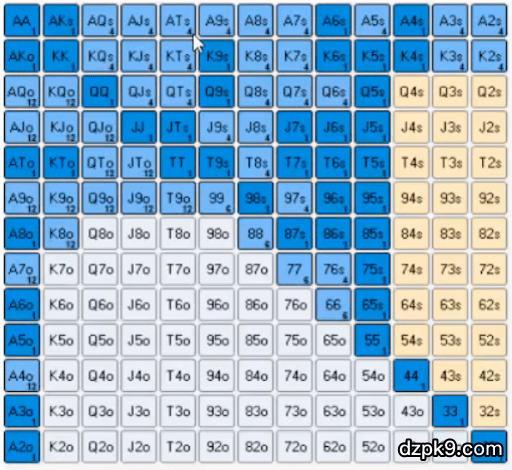 如果对手3-bet概率比较标准,这时候如果你加宽你的4-bet范围,他的弃牌率就会上升。你要扩展你的4-bet范围,把其它价值牌和一些诈唬牌也囊括其中,而不是一直用一个较窄的范围来打。