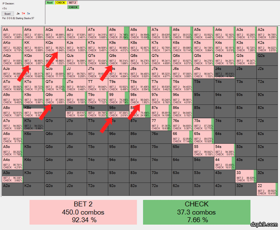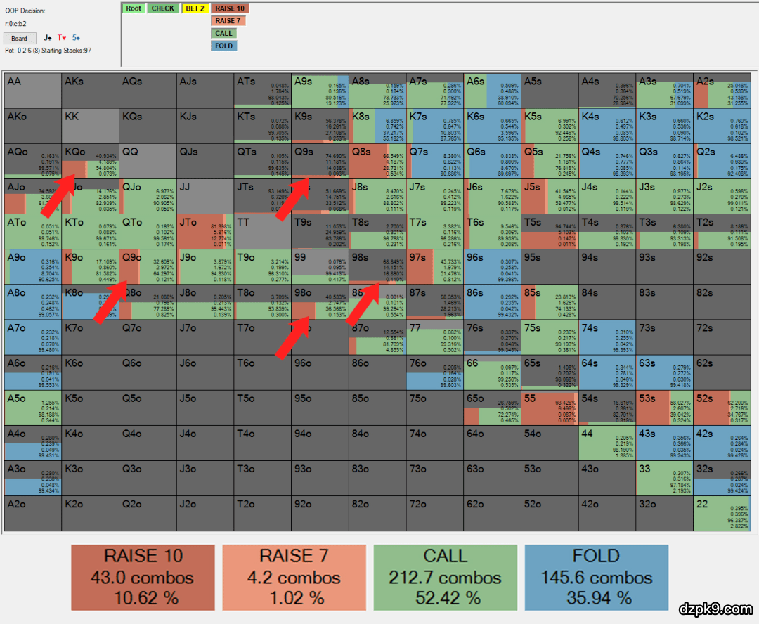 由图可见,当处在大盲位时,KQ、Q9和98的处理方法就多样很多,这说明GTO软件也认为用这些牌型走过牌-跟注和过牌-加注的路线是最优玩法。
