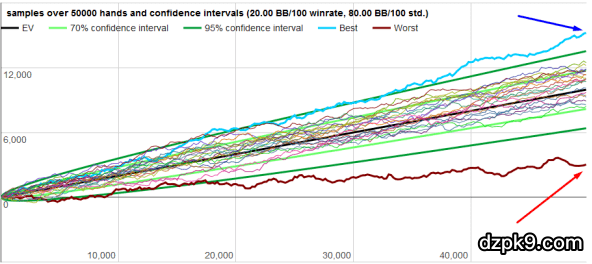 以50,000手牌作为样本,当一个玩家的盈率是20 BB/100时,他/她的波动情况如下图所示: