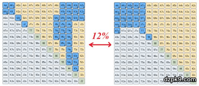 右边的底牌范围更适合那些不怎么弃牌反而喜欢跟注的玩家,当遇到这类玩家时,如果底牌的牌力比较弱,就不要3bet,更不要冒险诈唬。