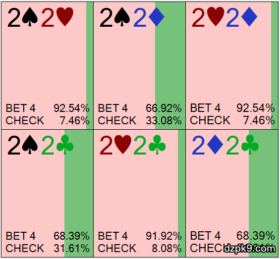 在某些情况下,你可以把你的小口袋对子转变成诈唬牌,而不是挥舞白旗。这是一种高级玩法,在某些情况下你可以尝试将它部署到你的策略中。在这篇文章中,我将向你展示一些适合采用这种玩法的情况,以及为什么。老派的德州扑克逻辑是,你不应该把具有摊牌价值的牌转变成诈唬牌。虽然这通常是正确游戏方式,但情况并非总是如此!在扑克策略软件出现之前,用小口袋对子半诈唬并非一种常见策略。但自从Solver软件出现后,我们发现在某些情况下用小口袋对子在翻牌圈和转牌圈半诈唬其实是一种很好的策略。(把一手有12张补牌的牌叫做半诈唬牌似乎有些奇怪,但我认为用这种方式思考是有益的。)我们来看一个常见的场景,在这个场景中你至少有时候应该用小口袋对子诈唬。例1:按钮玩家加注,大盲玩家跟注。翻牌是K♥9♥7♣。由于翻牌面联系紧密且存在很多听牌,所以理想的下注尺度是偏大的,比如2/3-3/4底池大小。通过使用这种大尺度下注,按钮玩家将迫使大盲玩家放弃22-66这样的牌。此外,即使是一些7x牌也会弃牌,特别是如果它们没有后门同花弃牌的话。我们来看看PioSolver作为大盲玩家对抗2/3底池大小下注会如何游戏:你可能会注意到7x组合上有很多蓝色,这意味着PioSolver经常弃掉这些牌。这些牌其实有足够的胜率去跟注,但它们仍然应该弃牌,因为它们在不利位置不能很好地实现它们的底池权益。这是因为它们在许多后续牌面对抗另一个下注难以有利可图地玩下去。如果大盲玩家真的放弃那些7x牌以及许多牌面比小口袋对子大的牌(比如Q6),按钮玩家将最小的口袋对子转变成诈唬牌是有意义的。现在我们来看PioSolver对于相同翻牌面(K♥9♥7♣)的解决方案,但这次是从按钮玩家的角度:你可以在上面截图的右下角看到PioSOlver如何游戏44的每一种组合。我们也来看看PioSolver如何游戏33和22的每个组合:如你所见,PioSolver更喜欢用最小口袋对子下注,而不是过牌,尤其是那些口袋对子带有后门同花听牌和同花听牌阻断牌的时候。你可能还注意到,口袋对子越小,下注越频繁,22是下注频率最高的。这是因为最小的口袋对子从保护那儿受益更多——比22大的高牌远多于比55大的高牌。用小口袋对子诈唬有意义的另一个时刻,是当你在河牌圈无法找到足够多的天然诈唬牌的时候。我们来看一个这样的情况:例2:按钮玩家加注,大盲玩家跟注。大盲玩家在K♣9♣2♥翻牌面跟注(过牌-跟注)2/3底池大小持续下注。河牌是一张4♣。假设你是这手牌中的大盲玩家。你在河牌圈可能用哪些牌诈唬?几乎每一种听牌都已经完成——顺子听牌(如QJ或JT)要么变成了顺子要么拿到了一对,同花听牌变成了同花。大盲玩家范围中仅有的纯空气牌是极少数在翻牌圈飘浮跟注的带后门同花听牌的AJo组合。那么,潜在诈唬牌特别少的情况下大盲玩家应该用哪些牌诈唬呢?带一张草花的55-77在这里是极好的诈唬牌(2x牌也是很好的诈唬牌,但它们不是本文的关注点)。是的,它们有摊牌价值。这些对手其实有相当多的摊牌价值——根据PioSolver的计算,它们约有25-30%的胜率。这是情况变得棘手的地方。当考虑特定情况的“完美”策略时,为使对手的范围不偏不倚,我们需要使我们的下注范围包括一定比例的诈唬牌。通过这么做,我们使得对手的一些抓诈牌(本来可以随后check实现底池权益的牌)变成了零EV(不亏不赚)的跟注牌。请看我为这种情况做的模拟运算,并注意PioSolver总是将这些中小口袋对子转变成超额下注诈唬牌:当我们范围中的(几乎)每一手牌胜率在20%-100%之间时,我们被迫用胜率最低的牌去诈唬。我澄清一下,这些牌不会为自己生成任何额外的EV。它们有很高的胜率,以致于要使按钮玩家严重过度弃牌才能使诈唬的EV高于过牌。虽说如此,如果对手注意到你从不用这些牌诈唬,并懂得这意味着什么,那么他就可以通过对你的下注过度弃牌来利用你的策略。那会严重损害你的价值下注牌的EV!当你是一名扑克新手时,你可以用非黑即白的方式(摊牌价值 =过牌)来思考问题。但是,你越是深入地理解这种游戏,你的感知中就会出现越多的灰色(小口袋对子 = 良好的诈唬牌)。在你的扑克之旅中,你需要始终保持初学者的心态,因为当你开始自认为完全掌握这种游戏的时候,就是你停止进步的时候。