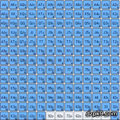 单挑玩太少的手牌是新玩家在SNG中最容易犯的错误。特别是来自其他变体的玩家,他们不习惯玩一个非常高的VPIP。然而,SNG的结构有利于在单挑中使用非常高的VPIP。对于大多数记分牌大小,尽量选择>90%。