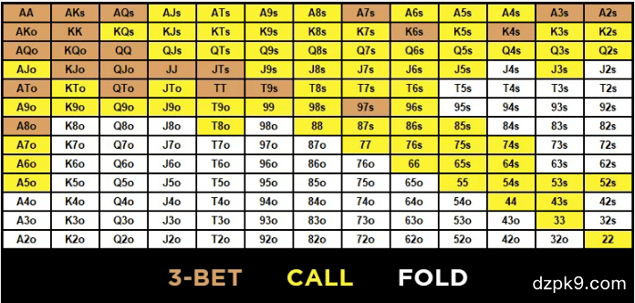 具体地说,你应该去掉你通常3bet范围的底端20-40%部分,选择用这些牌跟注。例如,也许你通常在大盲位置对抗按钮玩家的加注用下面的范围3bet。