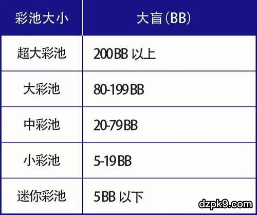和筹码量的计算单位一样,大家虽然都能很清楚能数的出来彩池有多少筹码,但是在德扑游戏中,最常被使用的“彩池单位”却不是筹码本身的面值,还是以“大盲注”(BB)作为彩池计算单位。以下是常见的彩池大小。(有时候根据其他条件对于彩池大小的定义会有所不同)