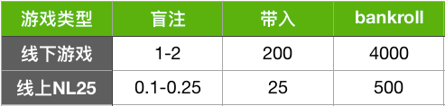 如果你打线上NL25,意味着盲注为0.1和0.25,那么你应该准备的20个带入Bankroll就为500。