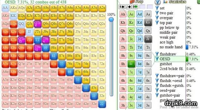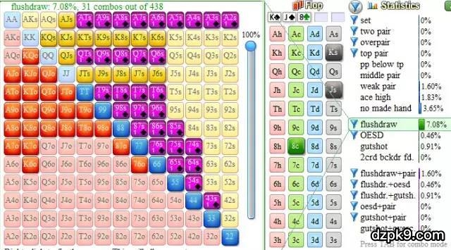 这里通常我们应该拿着AJ跟注,我们已经达成了控制底池的目的,对手是一条鱼,喜欢跟注很多同花听牌和顺子听牌,这个翻牌会让他跟注的听牌包括了所有两张黑桃。QT,T9,还有类似Q9这样的卡顺。假如他翻牌前会再加注JJ+和AQ,而跟注其他34%的牌,那么这个翻牌他会有31种同花听牌,32种顺子听牌,如图所示: