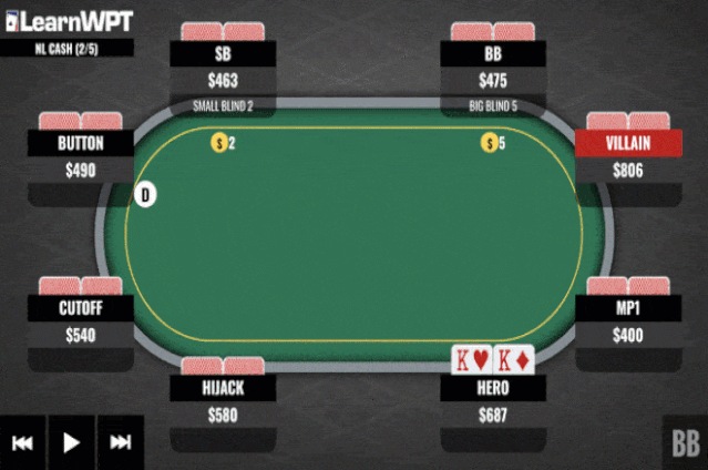 翻前,一名牌手在前面位置加注到7BB,你在MP2位置用K♥ K♦再加注到21BB,其他玩家弃牌,初始加注者跟注。