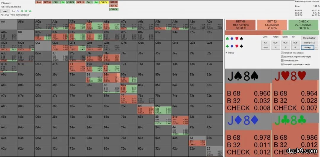 上图为软件给出的打法,根据它的建议,Fried在河牌应该用夭折的顺子听牌(如A5、A4、K9、Q9、J9、J8),以及范围中部分像AQ、AJ、KQ和QJ这样的高牌进行诈唬下注。就Fried拿到的这手J8s而言,软件给出的诈唬下注频率是96%,数量是建议全下。
