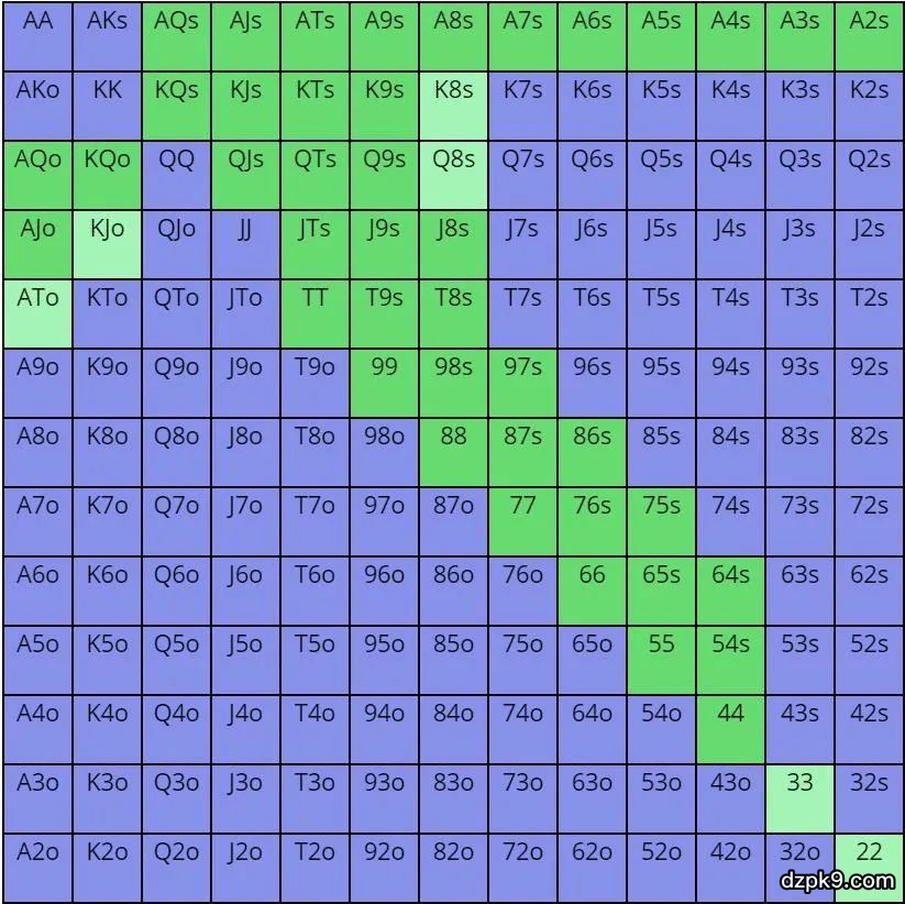 在碰上SB位下这个数量的3-bet时,如果这位对手是个很会打的玩家,那Fried应该用开局范围中50%的牌型继续下去,继续的方式可以是平跟,也可以是4-bet,而Fried平跟的范围应如下图所示↓↓↓