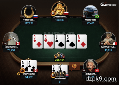 比赛进行到第15级别(1,250/2,500/300));当时JustaMortal(Aleks Dimitrov)用8♠8♣open $4,000;TheProjector(Diego Ventura)用A♠A♣3bet到$12,580;Dimitrov 跟注。