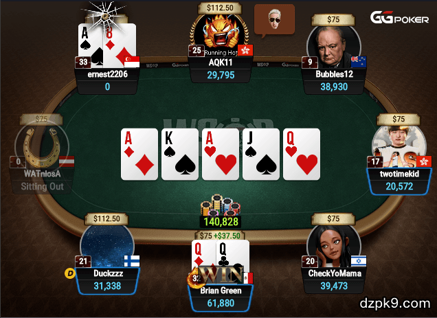 翻牌圈的两张A让ernest2206拿到了三条,但Brian Green用河牌凑成了葫芦,赢下了底池和赏金。