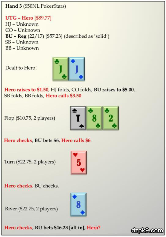 最终的问题是,Hero能否使用河牌圈弃牌不足(underfold)或过度弃牌(overfold)的一般性阅读。如果我必须在这两个选择中选择一个,我将过度弃牌我的范围,这是因为NL50级别的普通常客玩家不是很老练,可能使其范围偏重于价值牌而非诈唬牌,但这种阅读是非常不可靠的。但对抗不太疯狂对手的一个良好的法则是,因为对手的玩法很奇怪,而且投入了大量资金,这更可能是一个价值下注而非诈唬。很多常客玩家避免用这种惊世骇俗的玩法去诈唬。
