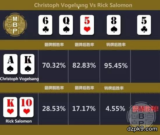 这是一局德扑俱乐部非常漂亮的成功诈唬,Salomon在UTG+1位拿到K♥-10♥,是一个不错的手牌,所以他选择首先加注525K吓走手持小牌的玩家。一番弃牌后轮到Vogelsang,他的手牌同样非常出众,A♠-K♠,同样可以拼同花、顺子等多种牌型,而且他的手牌还有A高牌,什么都没有拼到的话也还有A高优势,所以Vogelsang略作思考之后选择加注到1450K,同样希望是吓走小牌。此时双方的胜率之比约为Vogelsang 70.32% :Salomon 28.53%,Vogelsang 的A高牌让他获得了暂时的领先优势。