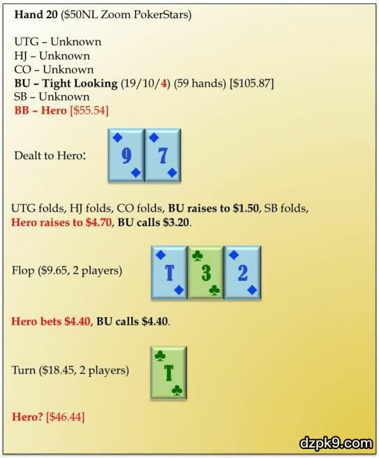 如果我们对抗标准常客玩家顾忌在这个转牌面check-raise,那么我们对抗更紧的牌手也讨厌check-raise。但是,在这里下注应该有足够的弃牌赢率,使得bet-fold玩法好过check-fold。只因为对手似乎偏紧并不阻碍他在翻牌圈用现在可能弃牌的牌飘浮跟注。