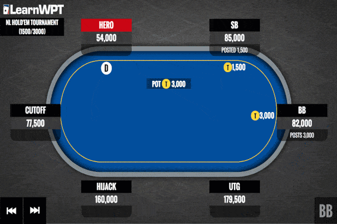 你在一场德扑锦标赛中握有18bb筹码。盲注1500/3000,前注500。桌上玩家筹码量如图。翻前,前面玩家都弃牌,轮到按钮位置的你行动。你会怎么玩?