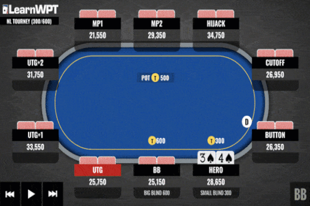 这手牌来自一场无限德州扑克锦标赛。盲注300/600,桌上玩家筹码量如图。翻前MP1玩家率先加注到3BB,劫位玩家、CO玩家和按钮玩家都跟注。你在小盲位置拿着4♠ 3♠,也跟注。大盲玩家弃牌。翻牌是2♣ 3♦ 5♠,现在轮到你行动,你会如何行动?
