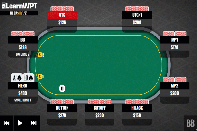 我们在小盲位置用同花AT补满去对抗多个对手是非常合理的。我们的底牌非常适合游戏多人底池,但它没有强到翻前高兴地打光所有筹码(如果枪口玩家在我们加注之后limp-reraise全压)。