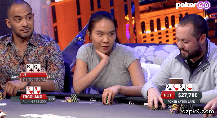 两人同意发牌两次。但JI老师有点不幸,第一张河牌是8♣,第二张河牌是10♥,两张牌都没帮到她。最终,Ercolano拿下底池,而JI老师不得不重新买入。