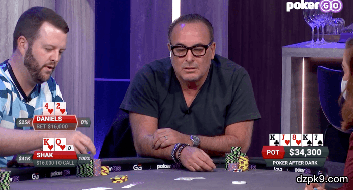 转牌是一张K♠。Daniels继续下注,这次是2300美元。Shak想了一会儿,然后加注到7000美元。
