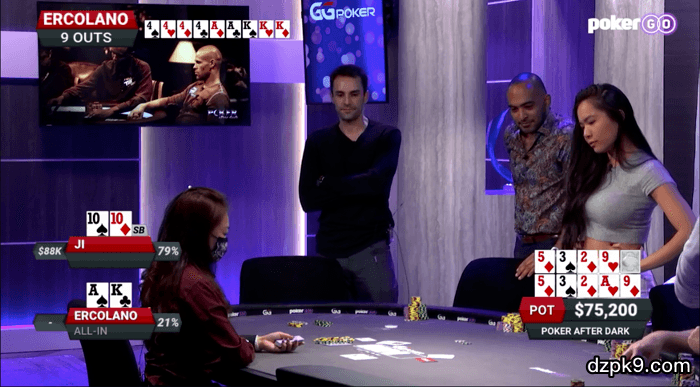 击中顶对的Ercolano跟注,这样Ji陷入了一个困难的情况。不过她最终还是决定跟注,然后拿下了这个$63,000的底池。