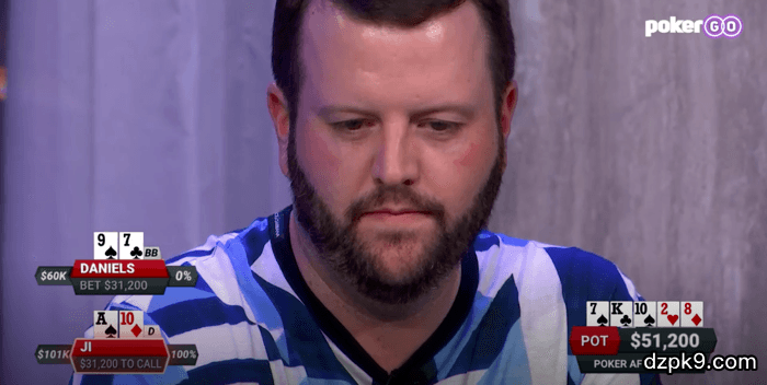河牌发出8♦,击中一对10的Ji拿着坚果牌,但Daniels往$20,000的底池里下了$31,200,这让Ji陷入了思考中。