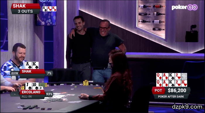 对Ercolano来说,幸好Shak要求发两次牌,因为第一张河牌发出K♥,Shak获胜。
