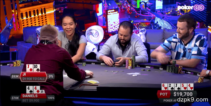转牌是2♥,Pope过牌,Daniels下注$5,700,只有Ji选择跟注。